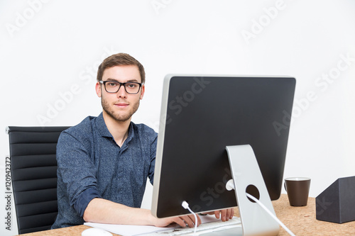 Businessman looking to camera at table