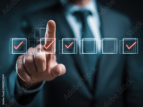 Businessman Making Reject Selection on Interactive Digital Approval System, Featuring Advanced Workflow Management, Decision Verification, and Professional Business Process Solutions.