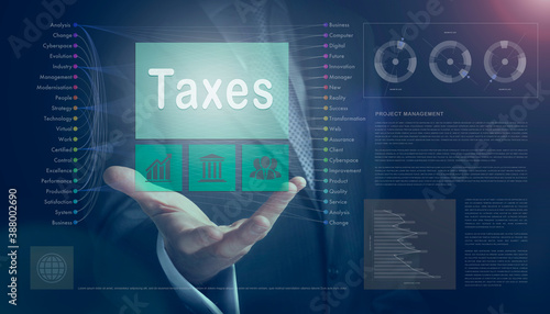 Businessman outreached hand holding a Taxes business concept on a computerised screen display.