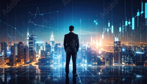 Businessman overlooking illuminated city skyline with overlaid financial data
