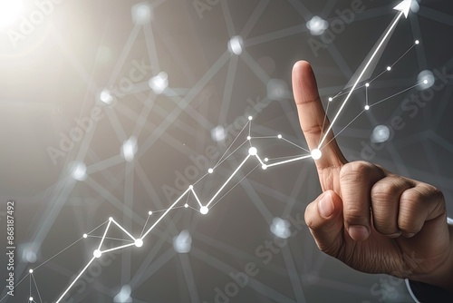 Businessman pointing at an upward trending line graph, representing growth, success, and business development in technology. Concept of investment, finance, and achieving goals.