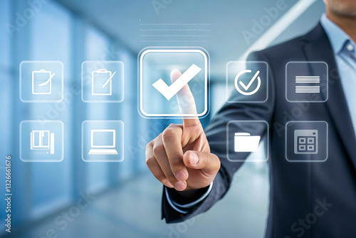 Businessman pressing a checkmark symbol on transparent digital interface, representing task completion, verification, and project approval, office work