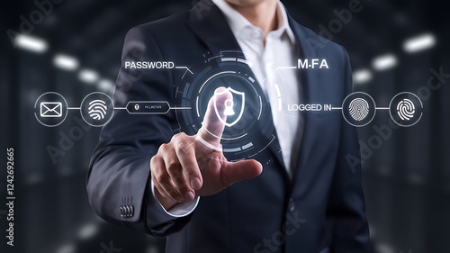 businessman pressing the virtual button MFA, multi-factor authentication. cloud computing concept, cloud technology, Saas, Paas, Iaas. AWS Services, ips, SSL, mfa, 2fa