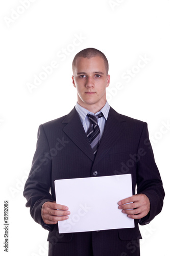 businessman showing a white card