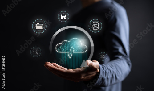 Businessman showing virtual glowing cloud computing to download and loading data information and upload on system network application. Technology transformation concept