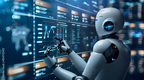 Businessman touch automated data management system to create reports with KPIs and indicators connected to the database. Data analysis with intelligent AI robot technology in business analysis.