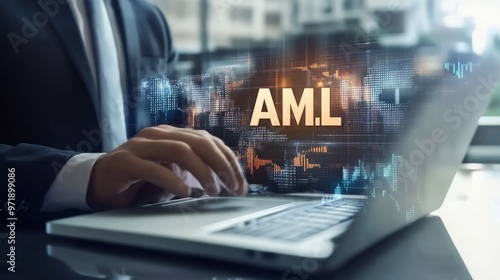 Businessman touching a virtual screen with the word "AML" and icons of financial business, law, and a ground banner for an airline system web page design concept, with a double exposure effect.