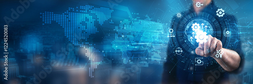 Businessman touching process automation tools, workflow optimization techniques, robotic process automation, task scheduling systems, data integration solutions, efficiency enhancement strategies.