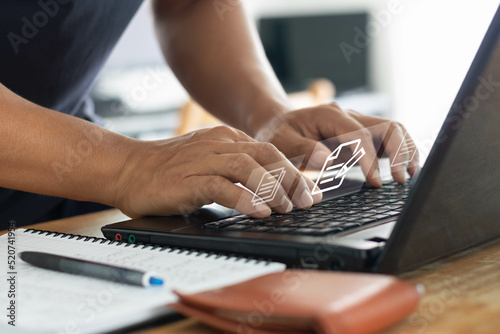 Businessman uses computer laptop for online editing document with the virtual screen. Online documentation database, Document Management System (DMS), Process automation to efficiently manage files.