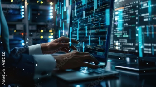 Businessman using a computer for document management, leveraging an online database and digital file storage system for record keeping, file access, and document sharing with modern software.