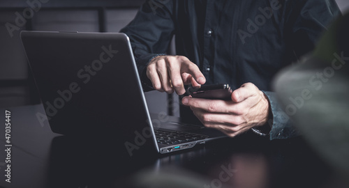Businessman using a smartphone and notebook in a moddy office