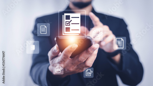Businessman using computer Document Management System (DMS), online documentation database process automation to efficiently manage files