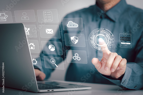 Businessman using fingerprints identification to access computer network