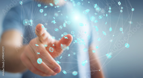 Businessman using flying network connection interface 3D rendering