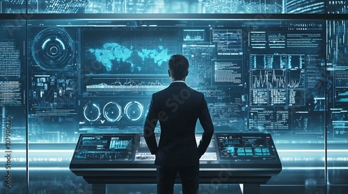 Businessman Using Futuristic Digital Interface to Analyze Environmental Data and Strategies