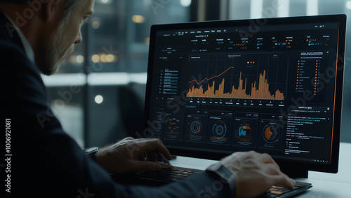 .Businessman using KPI dashboard.Financial business KPI System data analytics graph dashboard.Data System KPI and metrics connected in database for follow earnings,operations and sales data.