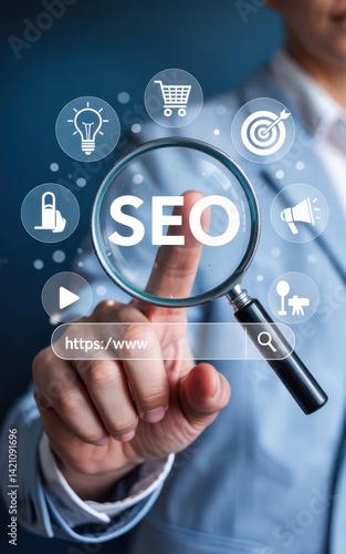 Businessman using magnifying glass to focus on seo search engine optimization.