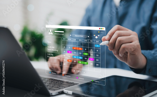 Businessman using stylus to plan schedule with digital calendar interface showing meetings project deadlines time management task list smart planning productivity workflow optimization