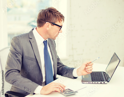 businessman with computer, papers and calculator