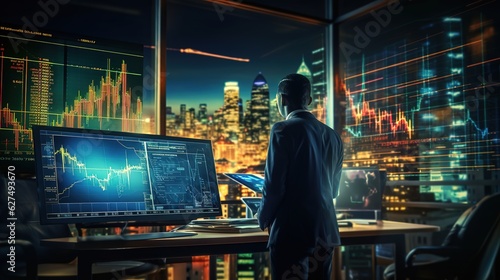 Businessman works on a computer with many screens, a control center with a large number of graphs, financial data, and a big data monitoring system, with generative ai
