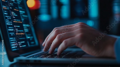 Businessman's Hands Typing on Laptop with Digital Financial Data on Screen