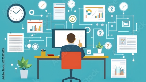 Businessperson Analyzing Data on Computer Screen Surrounded by Informational Graphs and Charts