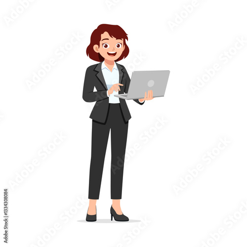 Businesswoman in Suit Holding Laptop While Smiling and Typing, Standing on White Background