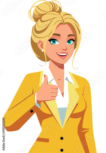 Businesswoman in yellow jacket giving thumbs up positive gesture vector illustration