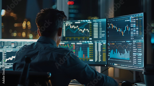 Bussinesmen looking at screen about Financial Business Analytics Data Dashboard, back view.