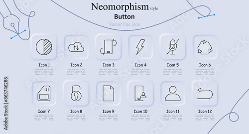 Button set icon. Half circle, upload, refresh, lightning bolt, microphone off, recycle, memory card, lock, document, user profile, back arrow. User interface, action, and control concept