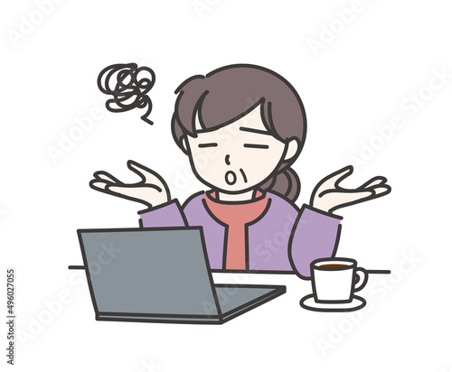 パソコンの前でお手上げ状態になった年配の女性C【ノートパソコン】