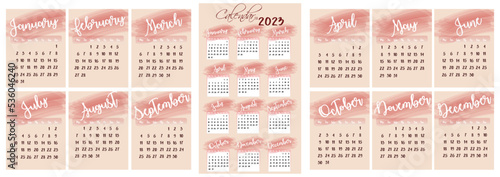 Calendar for 2023 on a light background in pink shades. A simple calendar. Full calendar for all months. Template for printing. Printed products on paper, cardboard.