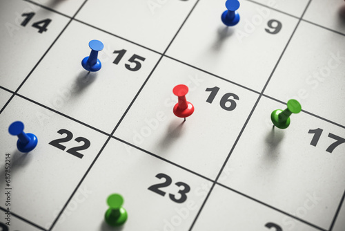 Calendar page with assorted colored pins marking multiple dates. Organizational tool concept. 3D Rendering