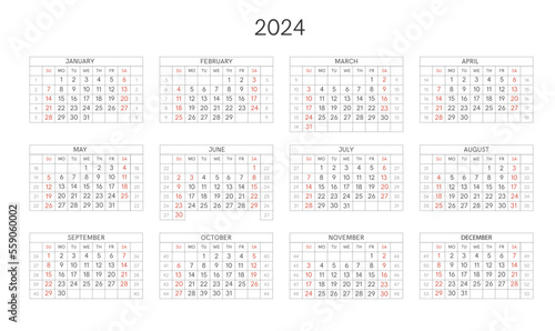 Calendar template 2024 horizontal.Week starts sunday.Vector template. Regular font