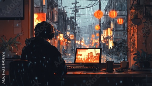 Calming LoFi scene in Japanese cartoon style a young person sitting at a desk with headphones by a rainy window