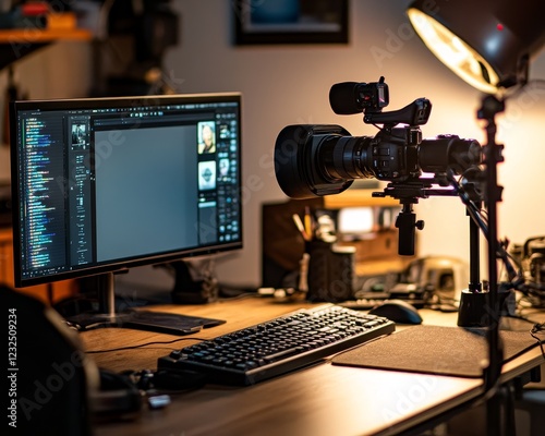 Camera and Computer Setup for Creative Project in Modern Workspace