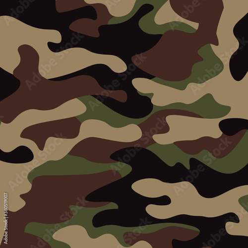 Camouflage pattern background. Classic clothing style masking camo repeat print. Green brown black olive colors forest texture. Design element. Vector illustration.