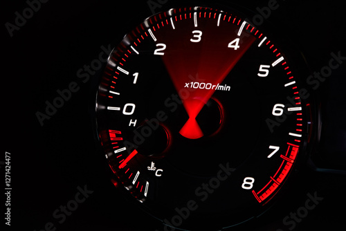 Car dashboard. Red arrow moving on tachometer and engine cooling temperature close-up