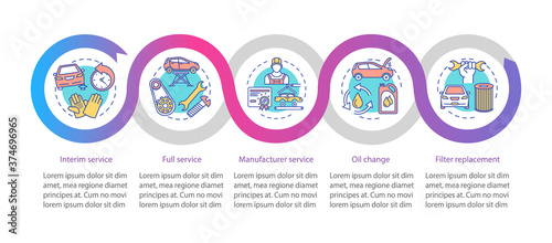 Car workshop vector infographic template. Auto service types presentation design elements. Data visualization with five steps. Process timeline chart. Workflow layout with linear icons