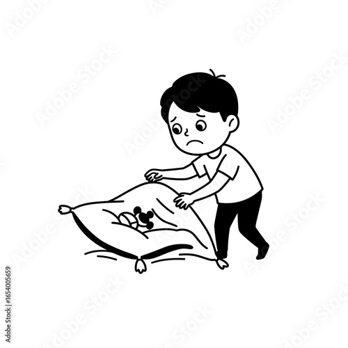 Cartoon Boy with Sad Expression Looking at Pillow with Stains.