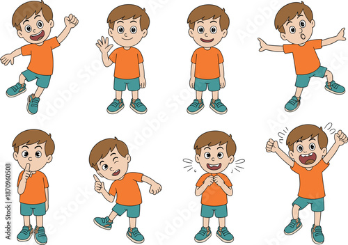 Cartoon character sheet illustration showing multiple poses expressions and design views for animation game design comic and mascot projects