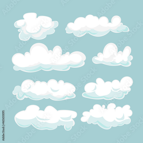 Cartoon clouds set isolated on blue background. Cloudscape in blue sky, white cloud vector illustration.