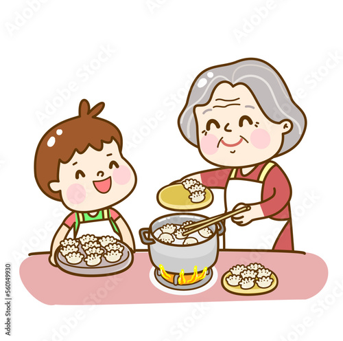 Cartoon family making Chinese dumpling.