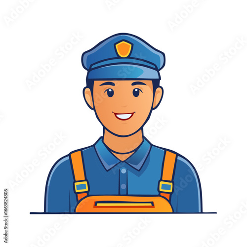 Cartoon illustration of a smiling utility worker in uniform with a cap, in a front facing half-body shot