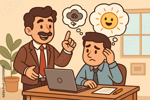 Cartoon mentor encouraging employee to shift negative mindset to positive thinking at work. Office coaching, psychology support, stress management, mental health, teamwork, workplace success concept