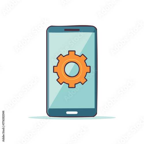 Cartoon smartphone with a large gear icon on the screen representing mobile settings or app development