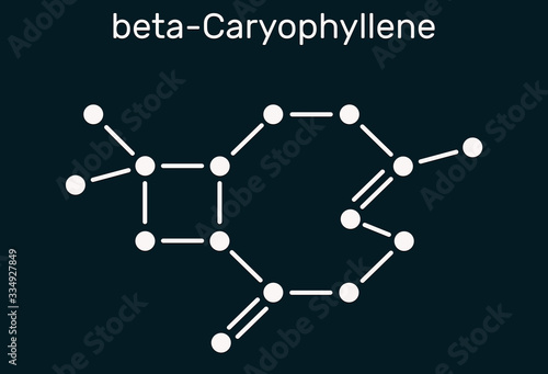 Caryophyllene, beta-Caryophyllene, C15H24 molecule. It is natural bicyclic sesquiterpene that is a constituent of many essential oils. Structural chemical formula on the dark blue background