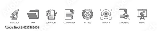 Case study icon set flow process which consists of research, data, conditions, examination, method, in-depth, analyzing, and result icon live stroke and easy to edit .