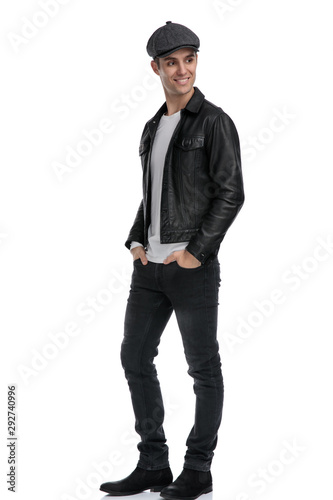 casual man standing with hands in pocket looking sideways joyfull
