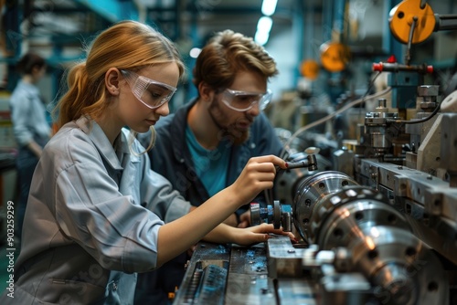 Caucasian engineer woman and man checking with lathe machine at lathe factory